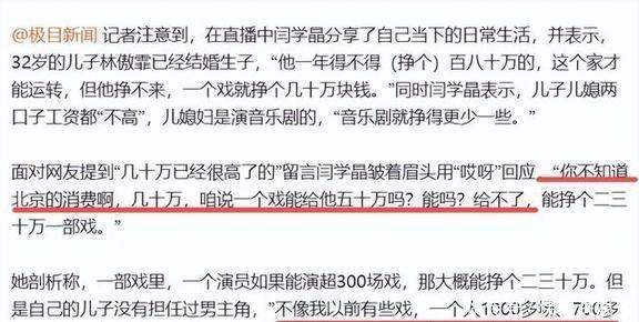 她原话是这么说的:“他一年得不得挣个百八十万的,这个家才能运转,但他挣不来,一个戏就挣个几十万块,孩子压力大。”听着好像真挺愁人的。同时闫学晶还补充了一句,说儿媳妇是搞音乐剧的,“音乐剧就挣得更少一些。”言下之意,儿媳妇那点收入更是不够看了。