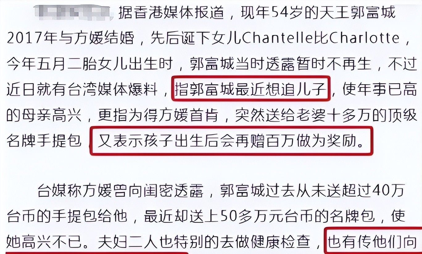 台湾与香港多家媒体报道称,方媛生下二胎后,郭富城便萌生再战一胎以求得子的念头。一向生活节俭的他,竟破例送出多件高档奢侈品作为鼓励,并承诺若成功生育三胎将给予额外奖励,似乎意在激励妻子继续尝试。